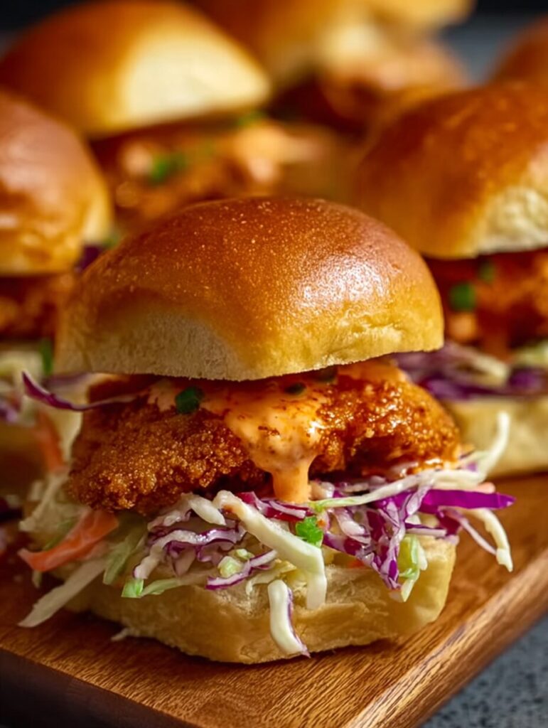 Mini spicy chicken burgers with a crispy crunch and creamy bang bang sauce, perfect for game day or casual dinners.