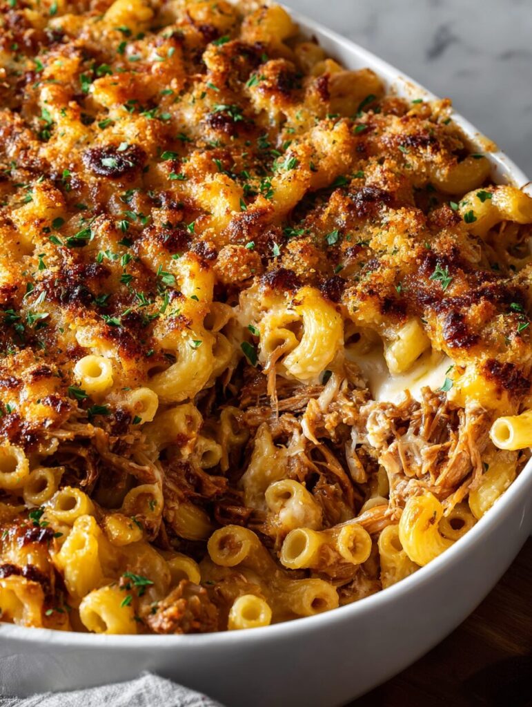 A delicious and hearty BBQ Pulled Pork Macaroni Bake that combines tender pulled pork with creamy cheese sauce and pasta, topped with extra cheese and breadcrumbs for a crunchy finish.