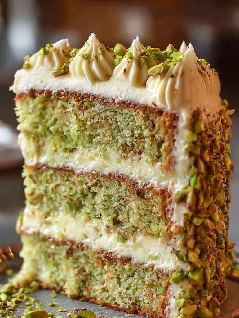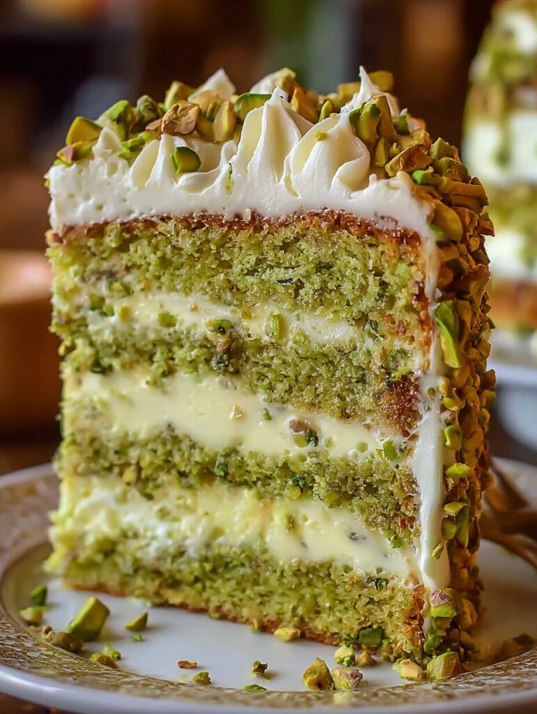 A moist and creamy pistachio cake layered with rich buttercream frosting, perfect for any occasion.