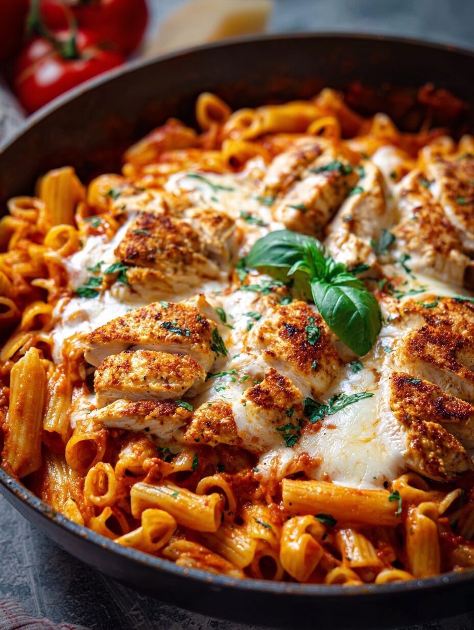 A quick and tasty Chicken Parmesan Pasta Skillet that combines tender chicken, pasta, and a rich tomato sauce topped with melted cheese.