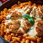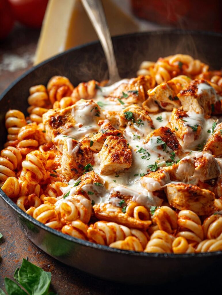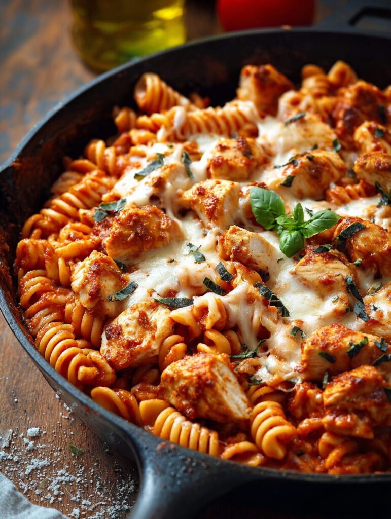 A quick and tasty Chicken Parmesan Pasta Skillet that combines tender chicken, pasta, and a rich tomato sauce topped with melted cheese.