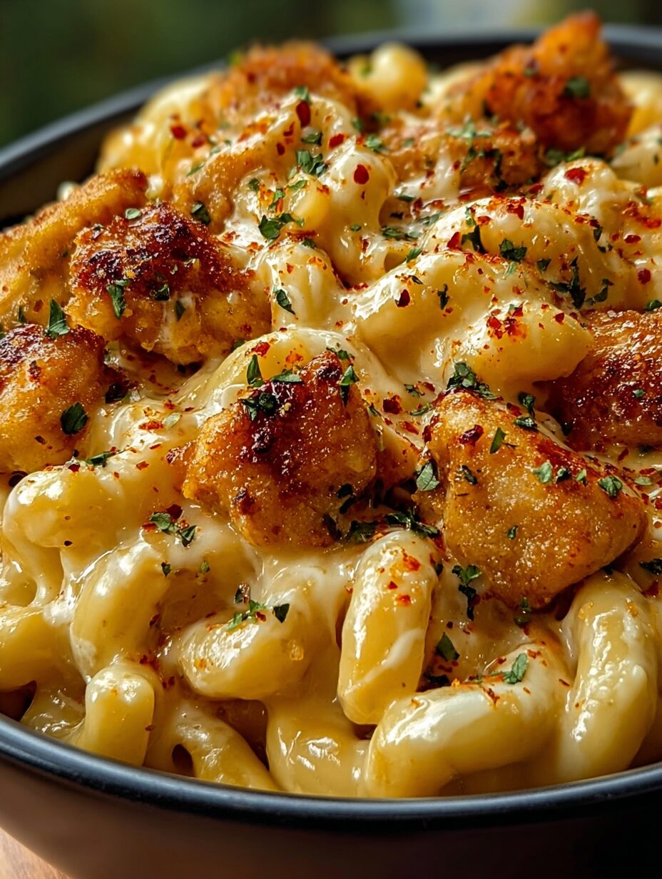 A delicious and creamy twist on traditional mac and cheese, featuring honey pepper chicken for a flavorful kick.