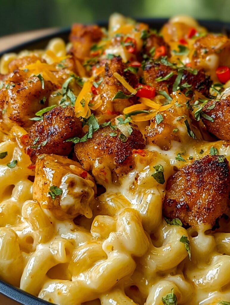 A delicious and creamy twist on traditional mac and cheese, featuring honey pepper chicken for a flavorful kick.
