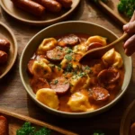 A hearty blend of cheesy pierogies and smoky kielbasa cooked to perfection in a slow cooker.