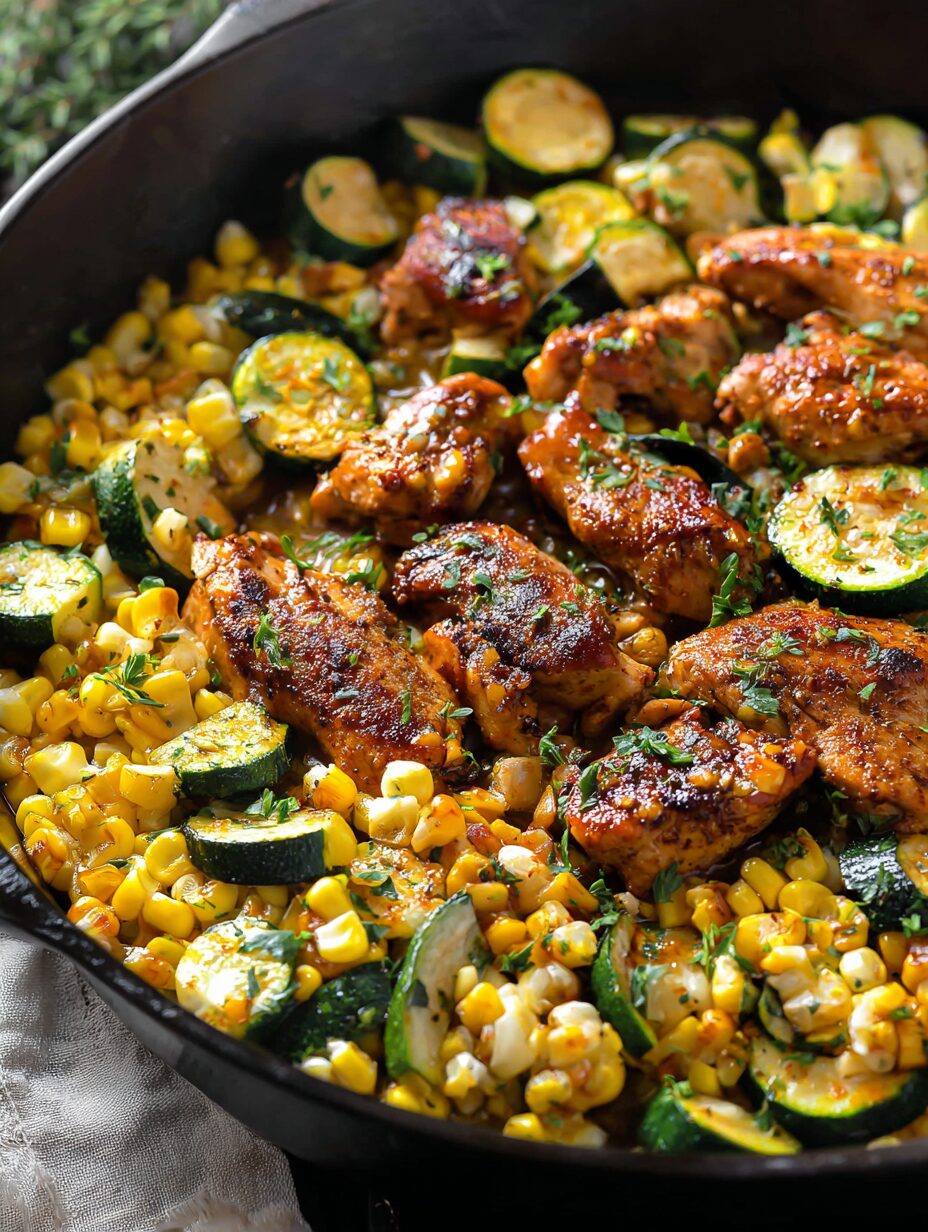 A delicious and easy recipe for Garlic Butter Chicken with Zucchini and Corn, perfect for a quick weeknight dinner.