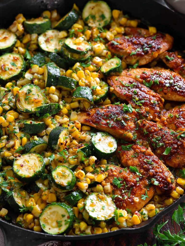 A delicious and easy recipe for Garlic Butter Chicken with Zucchini and Corn, perfect for a quick weeknight dinner.