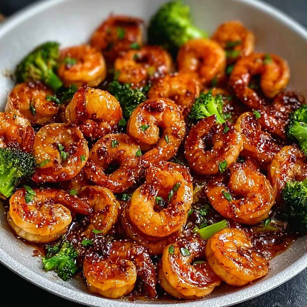 Once the shrimp are thoroughly cooked and the sauce has thickened to your liking, remove from heat. Garnish with sliced green onions and sesame seeds for added flavor and visual appeal. Serve immediately for the best taste, and enjoy the delightful combination of sweet and savory.