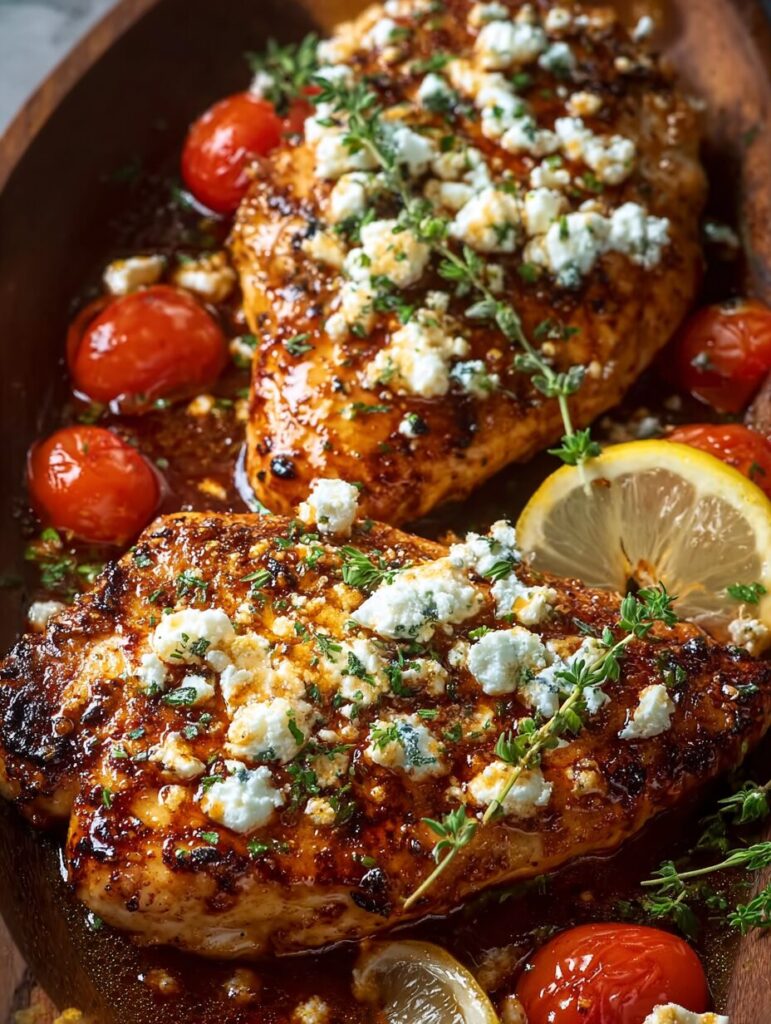 - Bake for 25–30 minutes, or until the chicken reaches an internal temperature of 165°F (75°C) and the feta topping is golden and crisp.